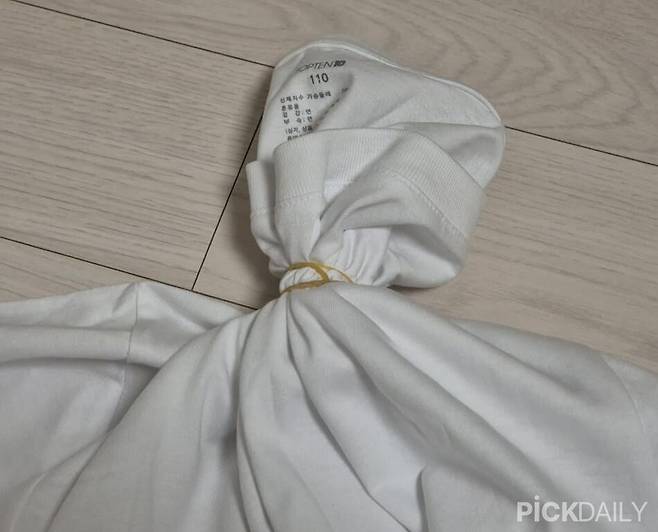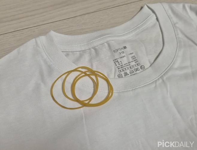 먼저 노란 고무줄을 세탁 할 때 사용하면 티셔츠의 목 늘어짐을 방지할 수 있습니다. 티셔츠나 맨투맨 같은 옷을 세탁기에 돌리고나면, 목이 늘어나 후줄근해진 경험이 많이 있을텐데요. 목부분을 고무줄로 먼저 묶어 준뒤, 세탁기에 넣고 세탁해주면 목부분이 고정되어 쉽게 늘어나지 않습니다. 물 속에서 다른 빨래와 이리저리 섞이더라도, 목 부분은 고무줄로 묶여 고정되어 있으니 다른 옷감 무게에 눌려 당겨질 일이 없게 됩니다