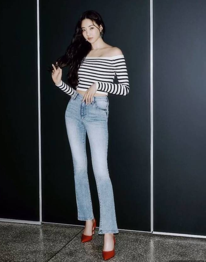 김사랑은 스트라이프 오프숄더 크롭 니트에 청바지를 입고 세련된 느낌을 자아냈다.