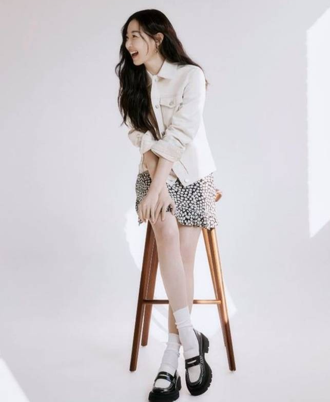 김사랑은 봄에 입으면 좋은 피치색 크롭 가디건에 연분홍색 청바지로 청순한 분위기를 자아냈다.
