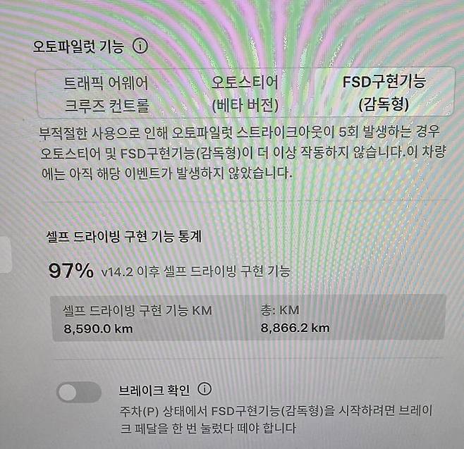 테슬라코리아가 밝힌 이 같은 기록은 차량 한 대당 감독형 FSD로 최소 2600㎞ 이상을 주행했다는 의미다. 블로터 취재에 따르면 2024년 12월 모델S를 중고로 구매한 오너 C씨는 감독형 FSD 최초 적용 후 총 8886㎞를 주행했으며 이중 97%인 8590㎞를 감독형 FSD로 달렸다. 특히 국내 테슬라 커뮤니티를 이끄는 운영자 ‘한테타’는 14.2 버전 소프트웨어 적용 후 총 2906㎞를 주행한 결과 99% 이상인 2877㎞를 감독형 FSD로 주행했다. 100일만에 800만㎞는 차량 한 대당 하루 평균 약 26㎞를 감독형 FSD로 주행한 셈이다.