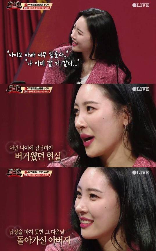 가수 선미는 초등학교 시절, 아버지와 두 남동생을 부양하는 사실상의 '가장'이었다. 아버지는 척추 결핵으로 움직일 수 없었고, 어머니는 생활고로 가족 곁을 떠났다.