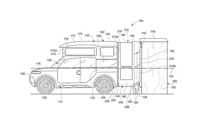 혼다의 특허 포트폴리오는 캠핑 크로스오버를 넘어선다. 이동 가능한 디바이더가 있는 모듈형 인테리어를 갖춘 콤팩트 픽업트럭 개념도 등장했다. 이 다목적 작은 트럭은 1인승 작업용 차량에서 2인승 화물차로 변신할 수 있다. 대담한 펜더 플레어, 전개 가능한 스텝, 그리고 전체 폭의 테일라이트 바가 견고하고 모험적인 느낌을 준다.
