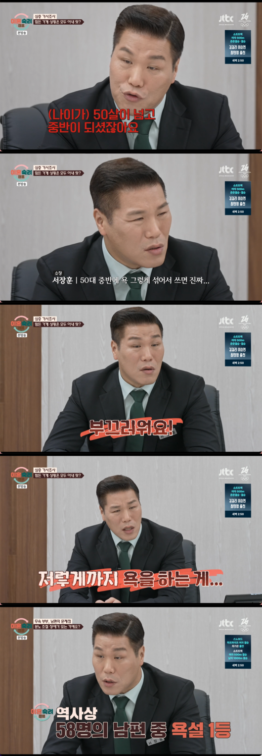 이를 지켜본 서장훈은 결국 따끔한 일침을 가했다. 그는 “우리가 실생활에서 말에 욕을 살짝 섞어서 쓰시는 분들이 많습니다. (그런데) 50살이 넘고 중반이 되셨잖아요. 욕 그렇게 섞어서 쓰면 부끄러워요”라고 꼬집었다. 이어 “저렇게까지 욕을 하는 게, 앞으로는 바꿔야 해요. 안 그러면 진짜 이상한 사람 돼. 바뀌셔야 해”라며 강하게 충고했다.
