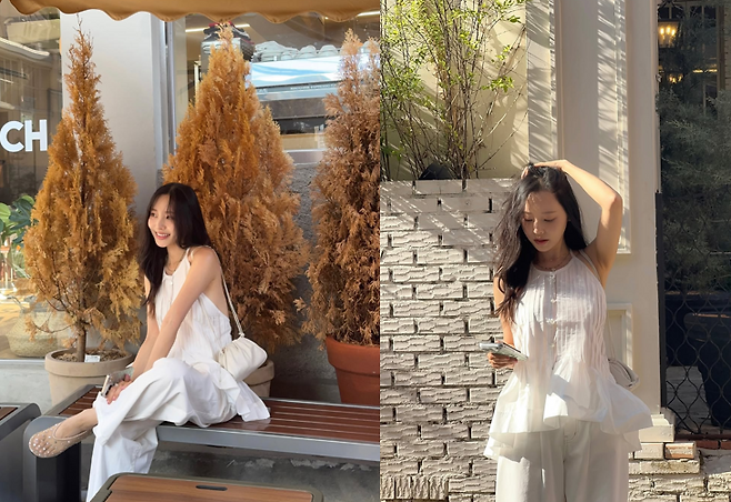 여름빛 가득한 카페 앞 벤치에 앉은 그는 아이보리빛 점프수트를 입고 환하게 웃으며, 마치 영화의 한 장면 같은 분위기를 연출했다.