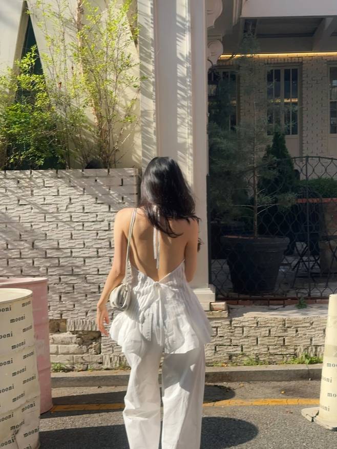 뒷모습으로 찍힌 또 다른 사진에서는 등이 드러난 홀터넥 스타일의 과감한 디테일이 시선을 끈다.