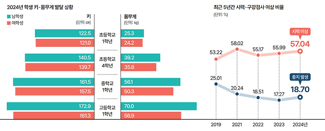 먼저 키와 몸무게를 보면 남학생의 경우 초등학교 1학년은 122.5㎝에 25.3㎏, 4학년은 140.5㎝에 39.2㎏이었습니다. 중학교 1학년은 161.5㎝에 56.1㎏, 고등학교 1학년 172.9㎝에 70.0㎏입니다. 여학생은 초등학교 1학년은 121.0㎝에 24.2㎏, 4학년은 139.7㎝에 35.8㎏였습니다. 중학교 1학년은 157.5㎝에 50.3㎏, 고등학교 1학년 161.3㎝에 56.9㎏으로 조사됐습니다.