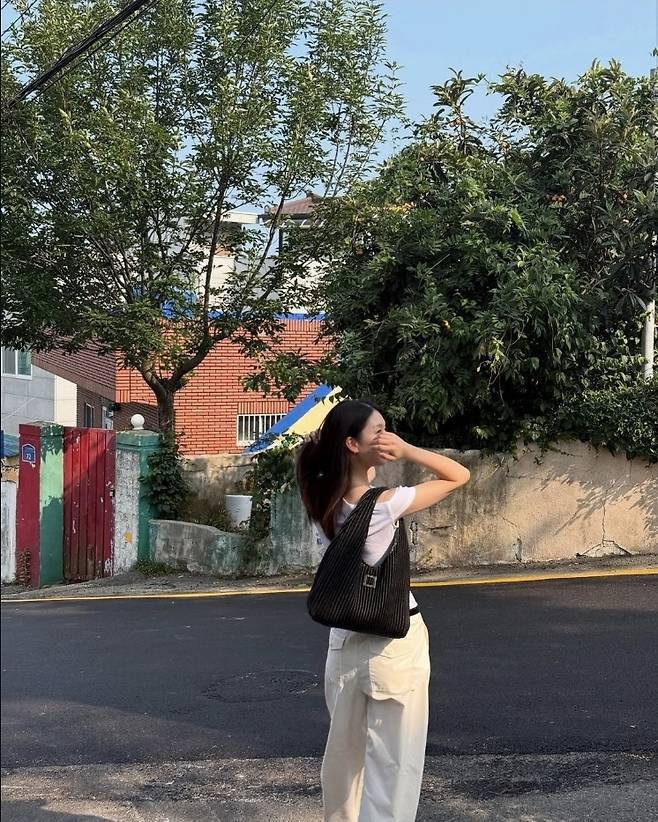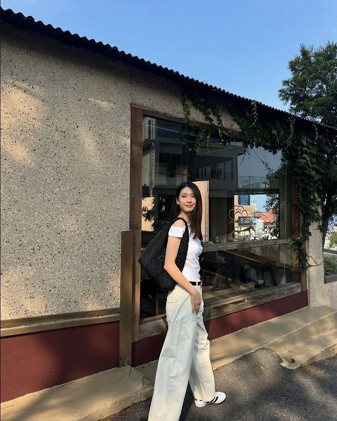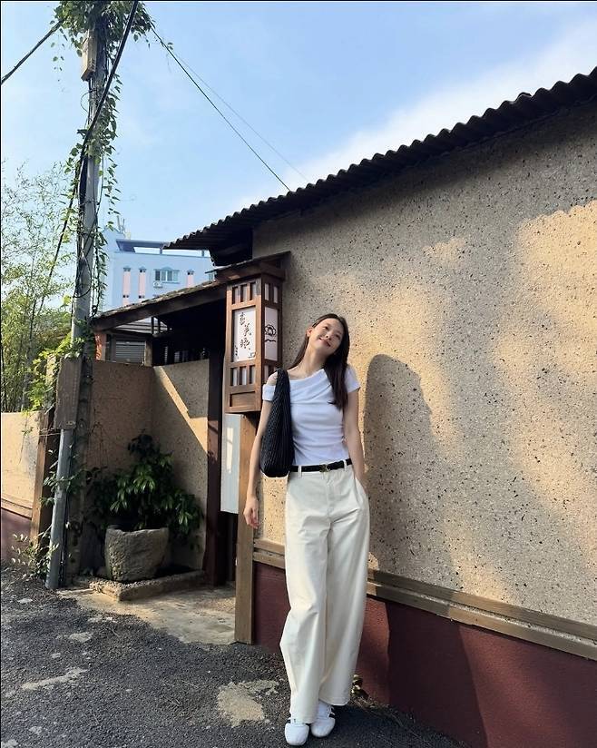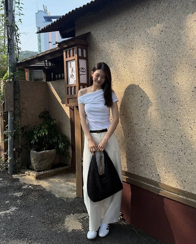 김진경은 한쪽 어깨가 자연스럽게 드러나는 언밸런스 화이트 티셔츠에 와이드 핏의 아이보리 팬츠를 매치해 전체적으로 여유로우면서도 시크한 무드를 연출했습니다.