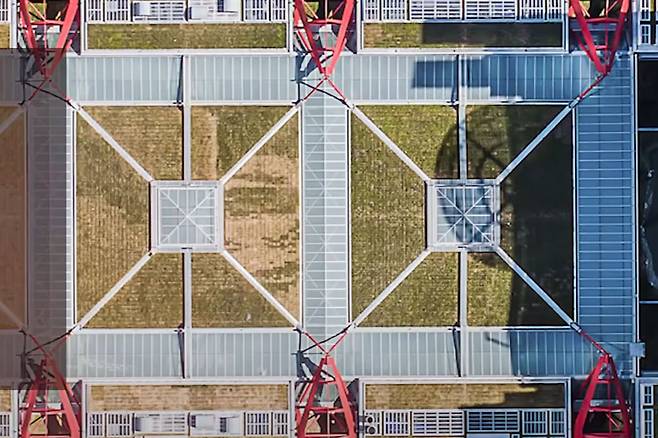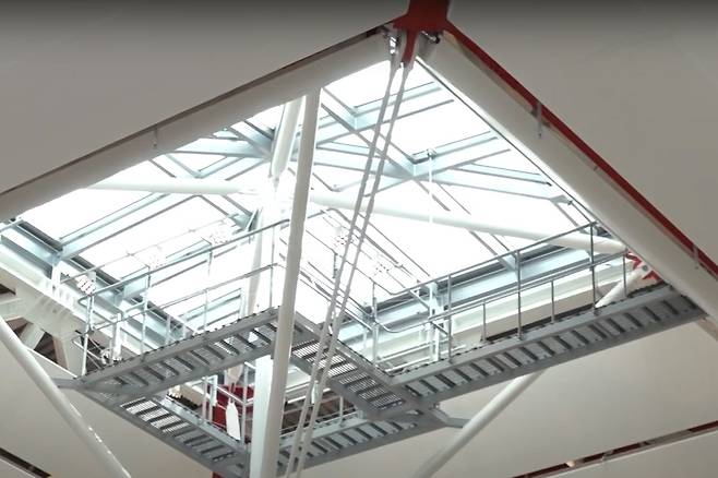 더현대서울의 지붕 크기는 가로 135m, 세로 50m 규모의 국내 쇼핑몰 중 가장 큰 대경 간 구조물로 지붕의 무게를 적절히 분산시키는 게 중요한데 이를 국내 최초 ‘크레인 고정 방식’을 적용한 것이다. 우리나라의 방패연을 닮은 카이트(kite)의 꼭지에 하나씩 크레인을 달아 총 8개의 크레인으로 지붕을 받치게 설계할 수 있었다.
