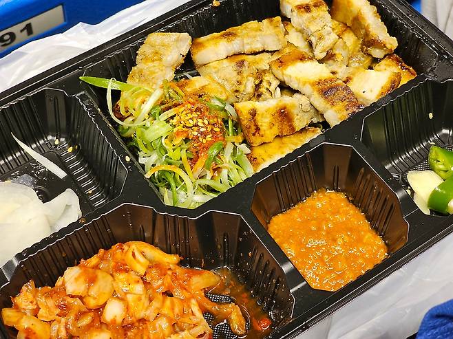 2층 광장에서 3층으로 올라가는 길목에는 삼겹살 도시락을 판매하는 ‘통밥’이 있다. 도시락은 삼겹살 1인분과 김치, 쌈장, 청양고추, 무쌈, 파채가 담긴 구성으로, 퀄리티에 대한 호평이 꽤 나오는 편이다. 도시락과 면류가 같이 나오는 ‘삼겹살 세트 C’가 인기가 많은데, 면 메뉴는 김치말이 국수가 단연 베스트셀러. 다만 경기 초반 방문하면 약 1시간의 대기까지도 발생하지만, 번호표를 받아 두면 대기 시간 동안 경기를 보다 오는 것도 가능하다.