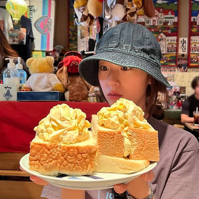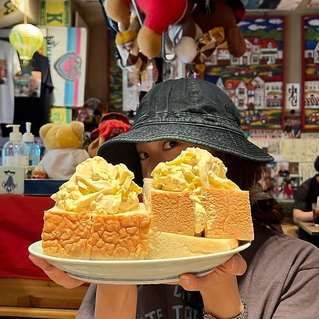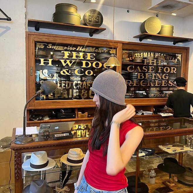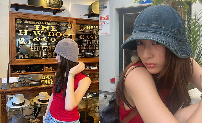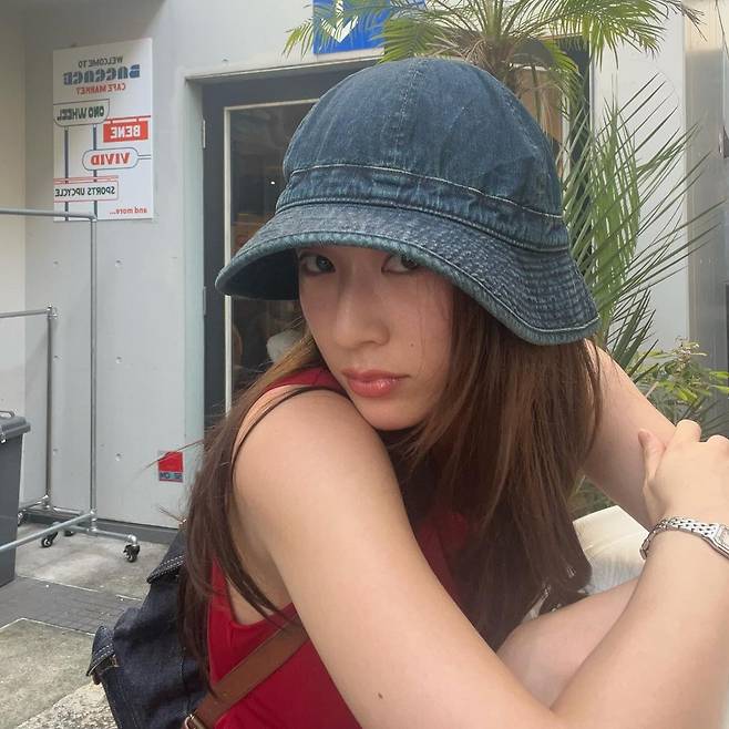 사진 속 정수정은 빨간 민소매 티와 청바지를 입고 청 모자를 쓰고 캐주얼한룩을 선보였따.