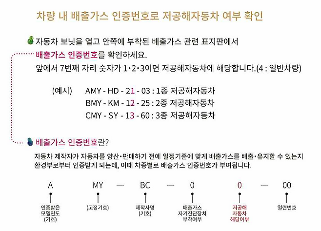 저공해 차량 조회 방법은 무공해차 통합 누리집 사이트를 통하여 차량 번호를 입력한 후 조회가 가능하며, 자동차의 본닛을 열어 배출가스 인증 번호를 확인할 수도 있습니다. 2020년 4월 3일 이후부터는 경유를 원료로 사용하는 자동차의 경우 저공해차량 대상에서 제외되었습니다.