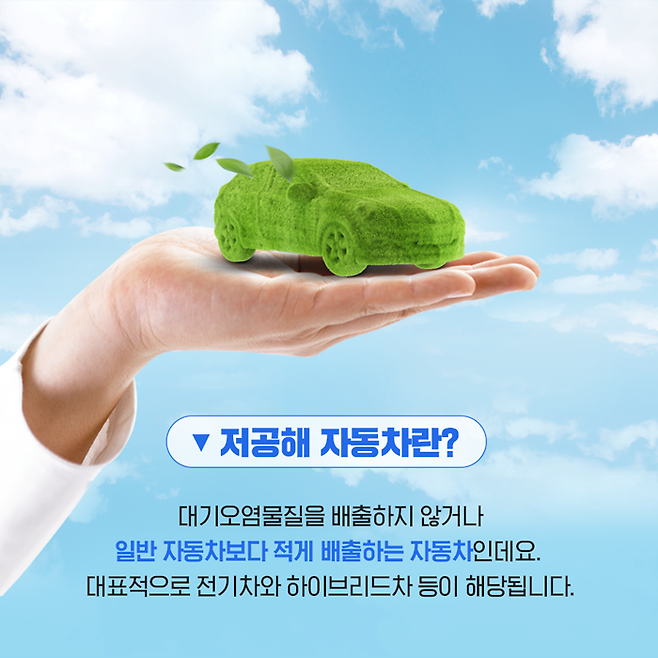 대기오염물질을 배출하지 않거나 일반 자동차보다 적은 양을 배출하는 자동차를 말합니다. 최근 대기오염의 문제로 배출가스 등급을 나누어 5등급 차량은 운행을 제한할 정도로 정부에서 나서고 있습니다. 보통 5등급 경유 차, 2005년 이전 배출 허용 기준에 따라 제작된 덤프트럭, 콘크리트 펌프 트럭 종류들은 조기 폐차해야 할 정도이고 배출가스 저감 장치를 부착하도록 정부에서 비용을 지원하고 있습니다.