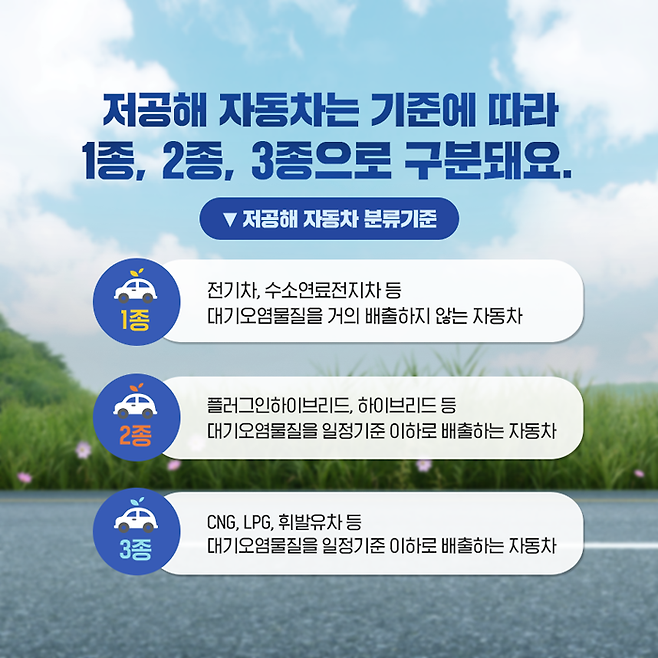 1등급 : 전기차, 수소차, 태양광 자동차는 대기오염물질을 배출하지 않아 1종 저공해 자동차로 분류됩니다.