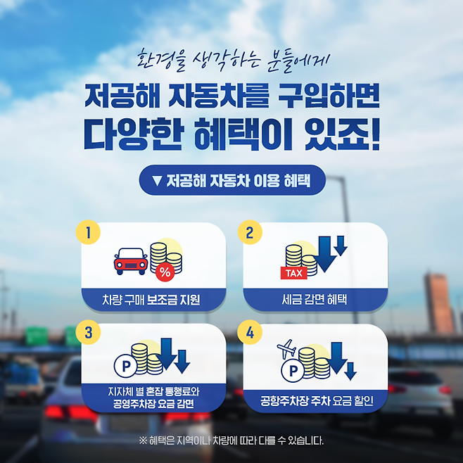 - 고속도로 통행료 할인: 전기차, 수소차는 50%의 할인을 받을 수 있습니다.