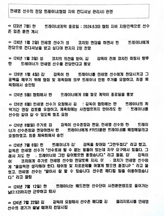 안세영이 수차례 언급한 A트레이너의 재계약 이슈와 관련해선 "안세영 선수의 요청으로 감독이 A트레이너에게 계약 기간 연장 검토를 요청했고, 체육회에 사전캠프만이라도 같이 가게 해달라고 협조를 요청했다"고 밝혔다. 올림픽에 참가하는 12명의 배드민턴 선수 중 안세영 선수에게 2024년 2월부터 전담트레이너를 지원해 부상의 관리와 회복을 도왔다. 올림픽에 출전한 143명의 대한민국 선수 중 개인트레이너를 지원받는 선수는 안세영이 유일하다. 6월말 계약 연장 후 올림픽 경기가 끝날 때까지 한달간 계약연장을 제안했다.