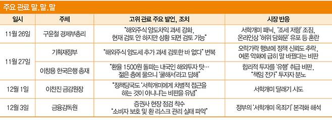 시장의 불안 심리를 다독여야 할 정책당국은 오히려 잇따른 말실수와 오락가락 행보로 불난 집에 기름을 부었다. 정책의 신뢰도가 바닥으로 추락하면서 정부의 메시지가 시장에 전혀 먹혀들지 않는 ‘영(令)이 서지 않는’ 상황이 연출됐다.