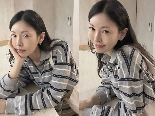수수한 회색 톤의 스트라이프 셔츠는 클래식하면서도 편안한 분위기를 연출했고, 무심하게 늘어뜨린 머리와 맑은 민낯 스타일링이 더해져 그녀만의 순수한 분위기를 극대화했습니다.