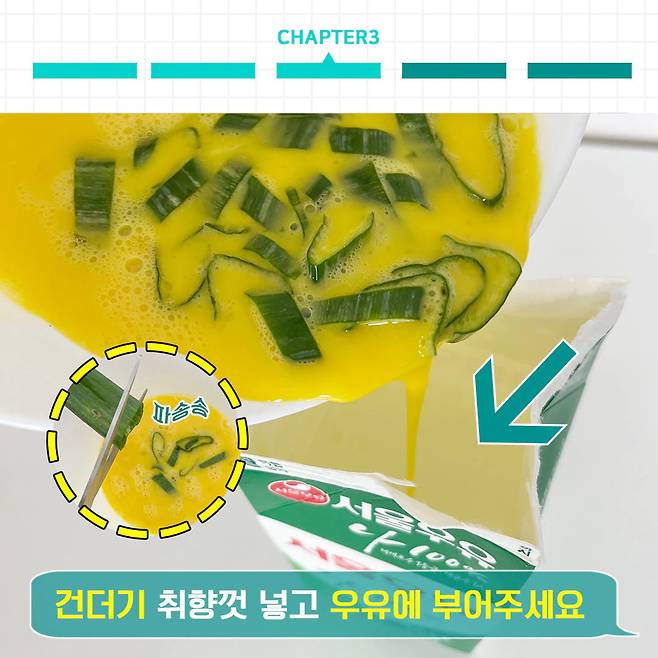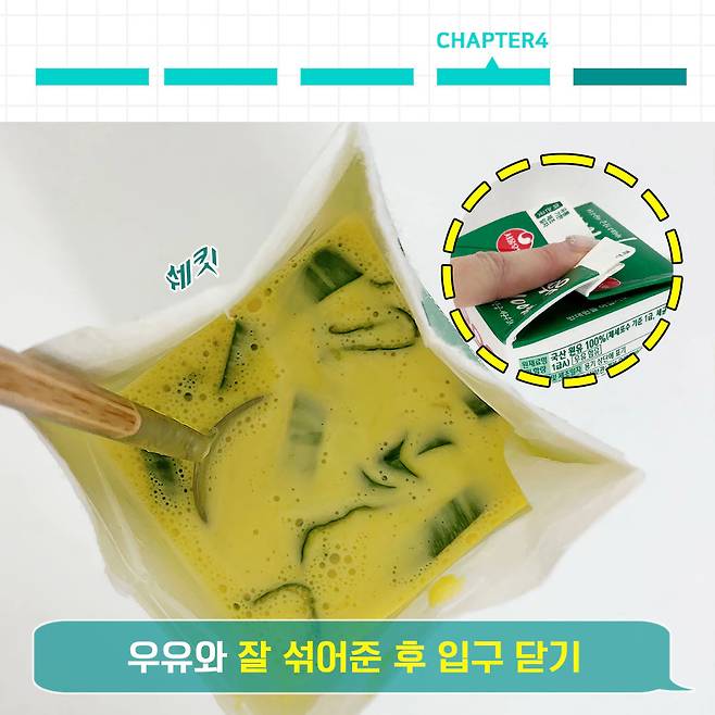 그래도 우유각 내에서는 계란이 잘 풀어지지 않는다거나 넘칠 수도 있으니 조심조심 해주는 센스!