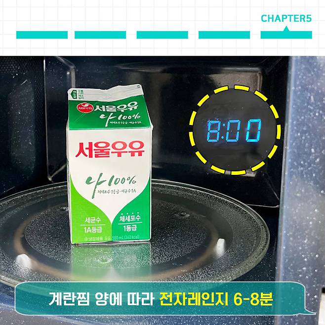 이제 기다림의 순간이에요. 계란찜 양에 따라서 6-8분 돌려주면 돼요. 저는 욕심껏 계란 3개와 우유 절반을 넣었기 때문에 8분 돌렸어요.
