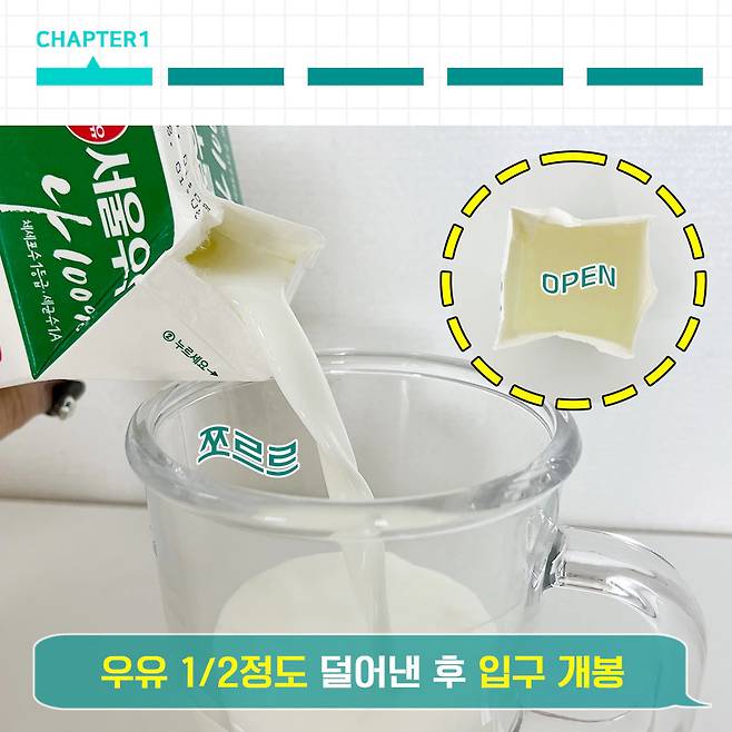 먼저 우유를 컵에 덜어주세요. 1/2 정도나 1/3정도만 남기면 OK. 저는 반에서 조금 더 우유를 덜어냈어요. 남은 우유는 아침을 먹으면서 한 잔 하면 딱!