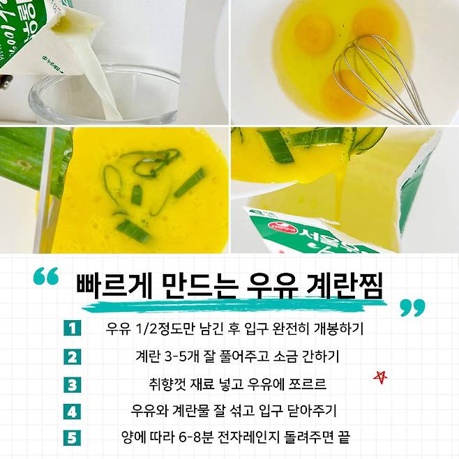 오늘은 밥심과 함께 초간단 우유 계란찜 레시피를 보았는데요. 어떠셨나요? 간단함을 강조하기 위해 아침에 제격이라고 말했지만, 사실 점심 저녁 야식 언제든 간편하고 건강하게 먹기 좋은 요리에요.