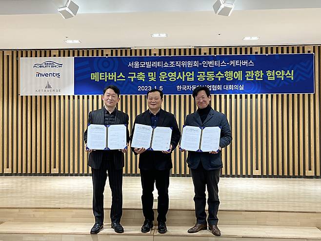 서울모빌리티쇼조직위원회*(조직위원장 겸 한국자동차산업협회 회장 강남훈, 이하 조직위)는 1월 5일, 서울시 서초구 자동차회관에서 (주)인벤티스·(주)케타버스 컨소시엄과 서울모빌리티쇼 메타버스 구축 및 운영사업 공동수행에 관한 업무협약을 체결하고, 2023서울모빌리티쇼에 메타버스** 도입을 결정했다.