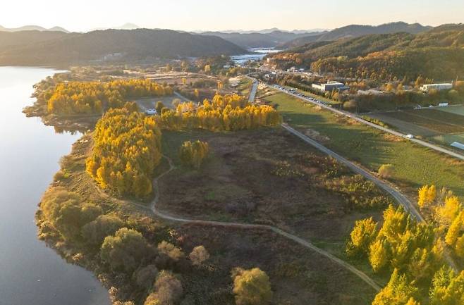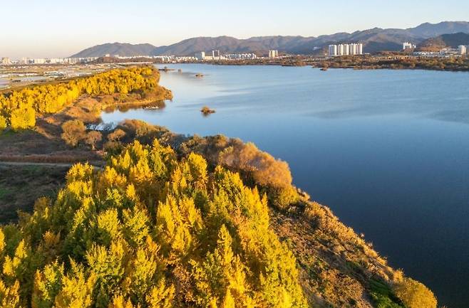 숲길 곳곳에는 포토존이 마련되어 있어 연인이나 가족 단위 방문객이 사진을 찍으며 추억을 남기기 좋다. 특히 햇살이 비치는 오후 시간대에는 노란 잎과 강물이 반사되어 사진마다 자연스럽게 따뜻한 색감이 담긴다.