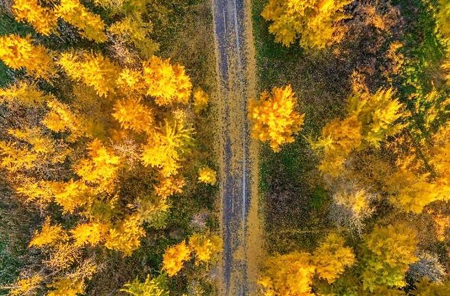햇살이 나뭇잎 사이로 스며드는 아침 시간대에는 노란 빛이 반짝이며 숲 전체를 따스하게 감싼다. 오후에는 바람에 흩날리는 은행잎이 바닥을 덮어, 마치 황금빛 카펫을 깔아놓은 듯한 장면을 연출한다. 바닥 위에 수북이 쌓인 낙엽을 밟으며 걷는 감촉이 기분 좋고, 은행잎이 공중에서 빛을 반사하며 떨어지는 모습은 사진으로 담기에도 아름답다.