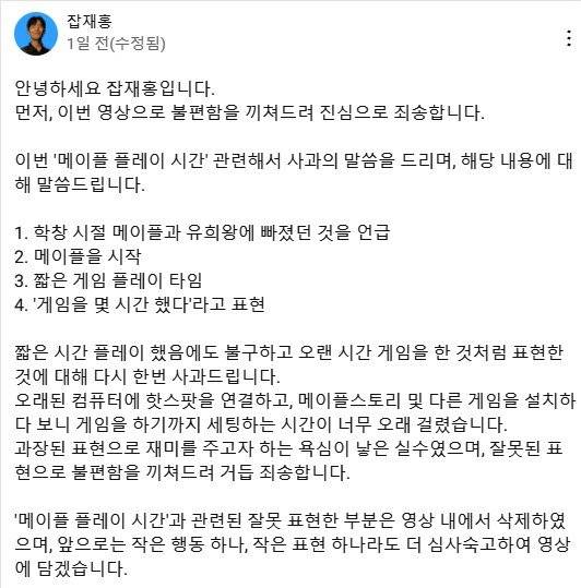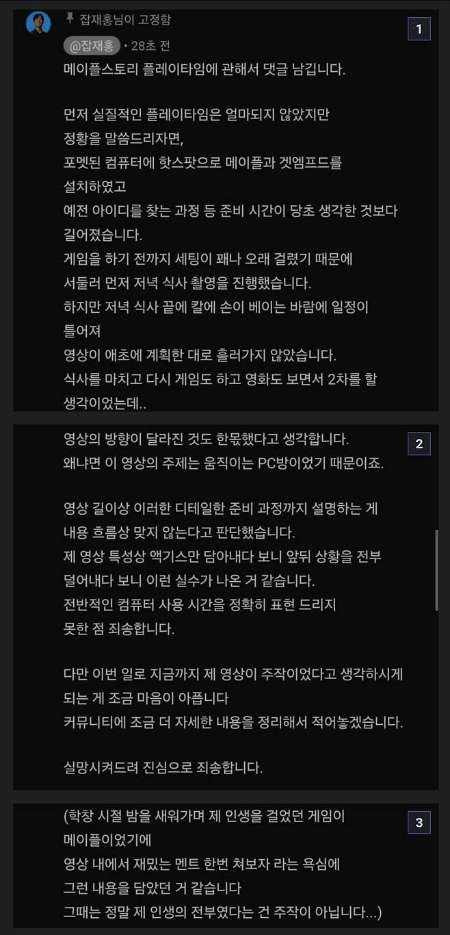 "몇 시간 동안 게임만 했다.", "스토리가 재밌다.", "메이플에 빠질 뻔 했다" 라고 말을 함