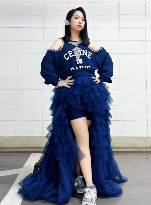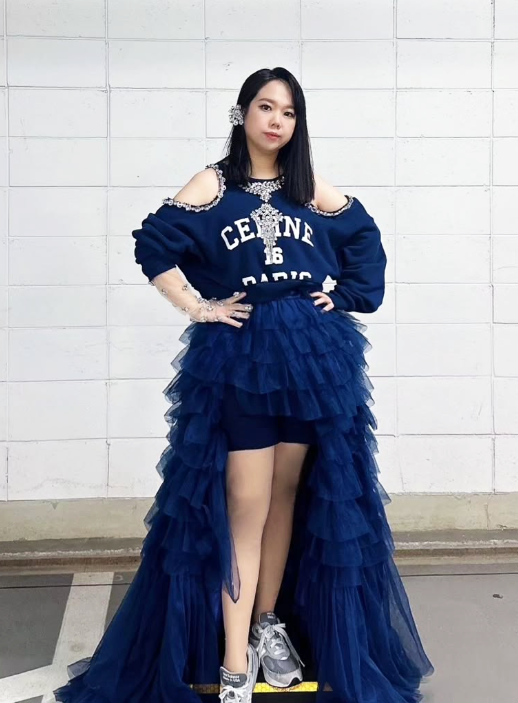 홍현희는 컷아웃 디테일이 돋보이는 네이비 컬러의 스웻셔츠에 풍성한 티어드 튈 드레스 스커트를 매치해 대조적인 스타일링을 완성했다.