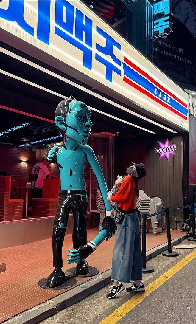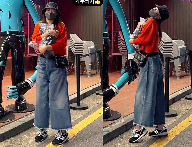 여기에 블랙 버킷햇과 마스크로 스타일리시한 시크 무드를 더했고 클래식한 샤넬 체인 크로스백으로 고급스러운 포인트를 놓치지 않았으며, 또한 블랙 앤 화이트 조합의 스니커즈로 완벽한 스트리트 패션을 마무리했습니다.
