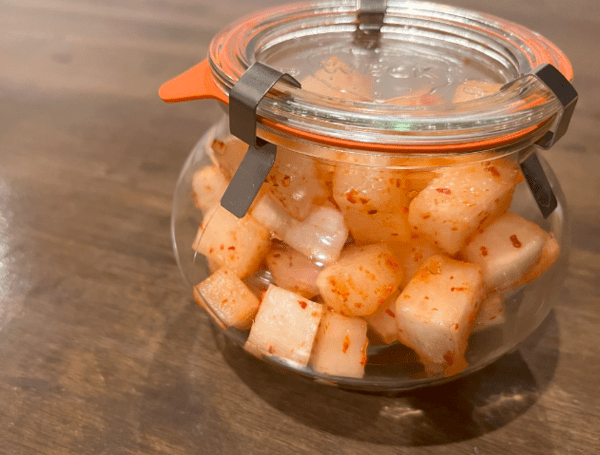 단, 너무 오래 두면 치킨무의 수분이 빠지고 질감이 물러질 수 있으므로 2~3일 이내에 섭취하는 것이 가장 좋다. 깔끔한 유리 밀폐 용기에 담아두면 더욱 신선하게 보관할 수 있다.