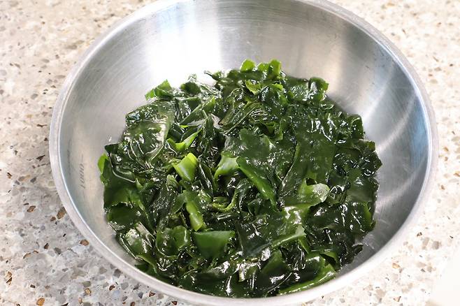 가장 먼저 할 일은 건미역을 불리는 일이에요. 약 3g 정도 물이 풍덩 담가 부드럽게 불립니다. 사실 전 더 불렸어요. 식구들 중에 미역만 먹는 친구가 있어서 푸짐하게 불리는 편이에요.