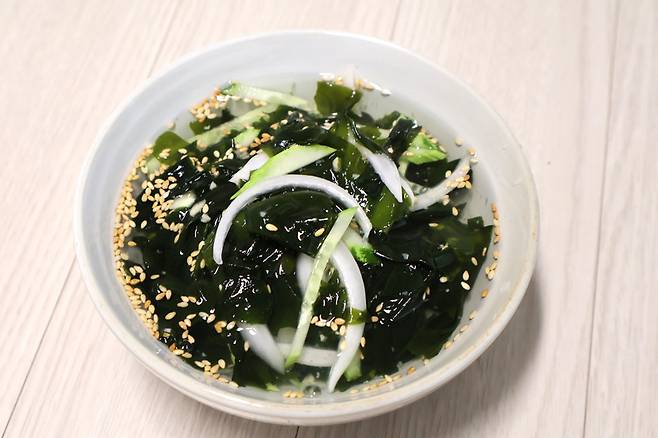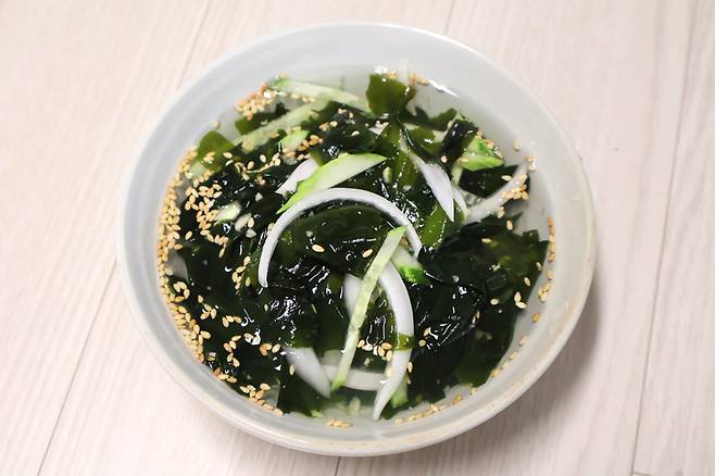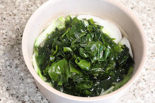 이제 준비한 재료를 모두 넣어요. 미역과 오이, 양파를 넣고 섞어주고요.