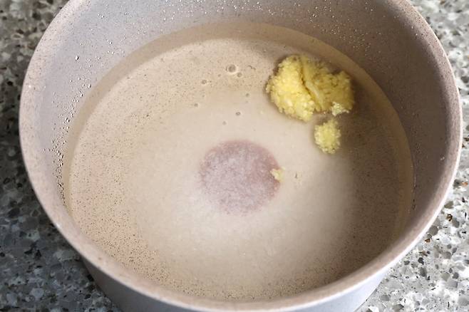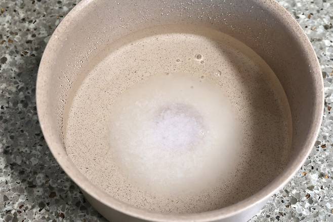 찬물이라서 설탕과 소금이 바닥에 가라앉아 있어요. 휘휘 저어서 완벽하게 녹여줍니다.