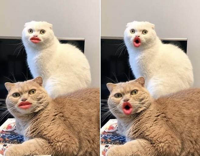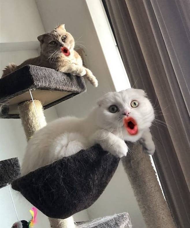 정작 자신들을 보는 사람들에게는 대폭소를 안겨줬지만 두 고양이들의 속마음은 "집사 도대체 뭐 하는 거야"라고 말하는 듯한 무표정이어서 또 다른 재미를 더할 따름이었습니다.
