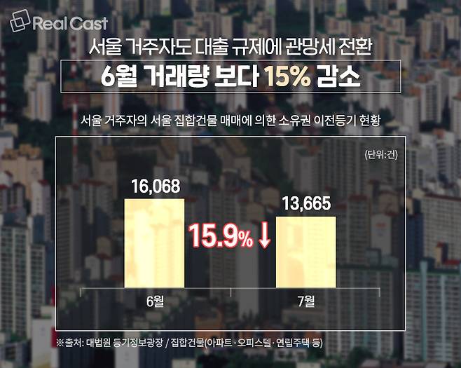 매매에 의한 소유권이전등기 통계의 외지인 거래 부분만이 아니라 서울 거주자에 의한 거래도 7월 1만 3,665건으로 6월(1만 6,068건) 대비 15%가 감소했습니다.