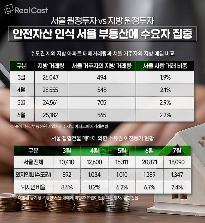 반면 대법원 등기정보 광장 서울 매매에 의한 소유권이전등기 신청자 현황을 보면 서울의 집합건물 거래의 6~8%를 비수도권(지방) 거주자에 의한 거래가 차지하고 있습니다.