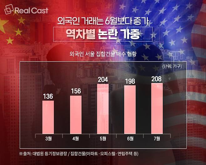 대법원 등기정보광장에 따르면 7월 외국인들의 서울 집합부동산 매입은 208건으로 6월(198건) 대비 5.1% 증가했습니다.
