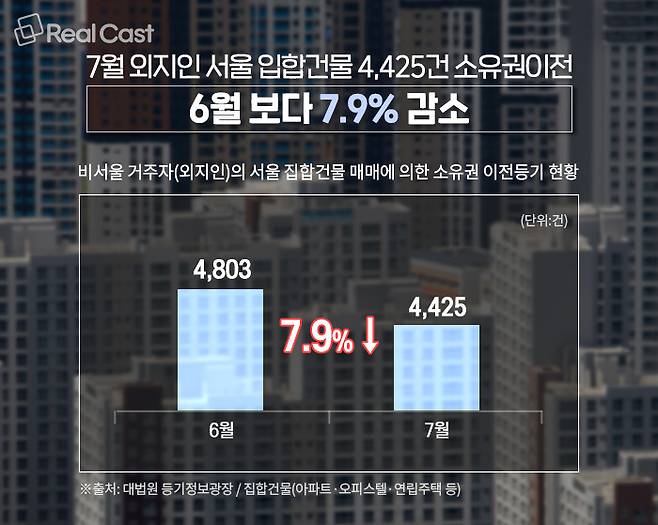 부동산시장 분석업체 부동산인포가 대법원 등기정보광장 ‘매매에 의한 소유권이전등기 현황’을 분석한 결과 7월 중 비서울 거주자(외지인) 중 서울의 집합건물을 매입한 건수는 총 4,425건으로 집계됐습니다. 이는 6월 4,803건 대비 약 8%(7.9%)가 감소한 수준입니다.