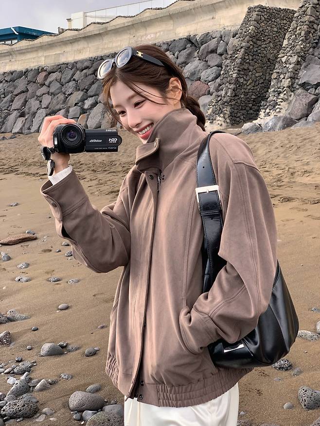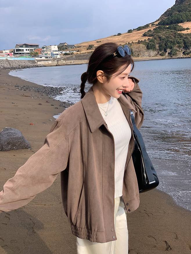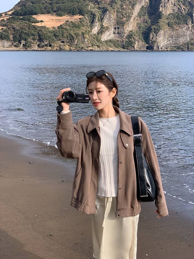 재킷의 넉넉한 품은 신유은의 가녀린 체형을 자연스럽게 감싸주며 전체적인 분위기를 한층 여유롭고 따뜻하게 만들어주네요.