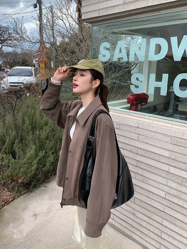 부드러운 질감이 느껴지는 짙은 갈색 재킷을 메인 아이템으로 선택해서 시각적으로 매우 안정감 있고 지적인 인상을 줍니다.