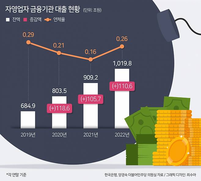 12일 한국은행이 양경숙 더불어민주당 의원실에 제출한 자료에 따르면 2022년 말 기준 금융기관 자영업 대출 잔액은 사상 최고액인 1019조8000억원으로, 코로나19 확산이 시작되기 전인 2019년 말(684조9000억원)과 비교해 약 335조원(48.9%)이 불어난 것으로 집계됐다. 이는 코로나19로 인한 단기적인 소비침체를 예상한 자영업자들이 부채를 통해 영업을 유지한 탓이다.