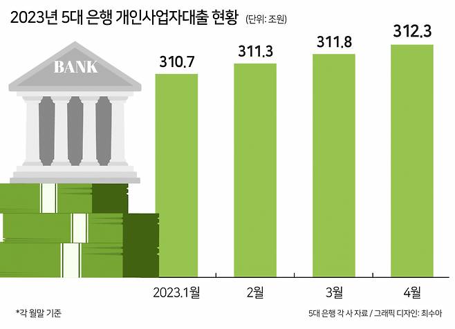 가장 큰 문제는 ‘울며 겨자먹기’식 적자 영업을 유지하는 자영업자들이 늘어나게 되면 결국 부실 눈덩이가 커질 수 있다는 것이다. 실제 자영업 대출 수요는 크게 줄지 않고 있다. 지난달 말 기준 5대 은행이 취급한 개인사업자대출 잔액은 312조3106억원으로 전월 말(311조7554억원) 대비 5000억원 가량 늘었다.