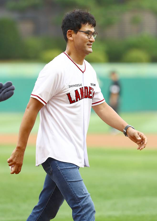 [서울=뉴시스] 조수정 기자 = 박찬호가 28일 오후 인천 SSG 랜더스필드에서 열린 KBO리그 SSG 랜더스와 LG 트윈스 경기에 앞서 시구를 마친 뒤 마운드를 내려가고 있다. (사진=SSG랜더스 제공) 2022.07.28. photo@newsis.com *재판매 및 DB 금지