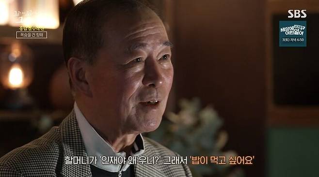 "배고프고 목마르고 해서. 제가 울려고 한 것도 아닌데 그냥 눈물이 나는 거예요. 할머니가 '인재야 왜 우니' 해서, '밥이 먹고 싶어요' 하니까. 할머니도 우시고 할아버지도 우시고. 옆집 어른들까지도 다 대성통곡을 하더라고요. 내가 말 한 마디를 잘못 해서…"