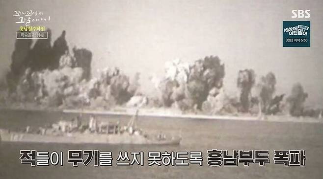 12월 23일 오후 12시. 이렇게 모두가 걱정하는 상황에서 메러디스 빅토리호는 820km의 항해를 시작해. 목적지는 부산이야. 그리고 버리고 간 군수품은 적들이 무기로 쓰지 못하도록, 흥남부두를 폭파해 버렸어.