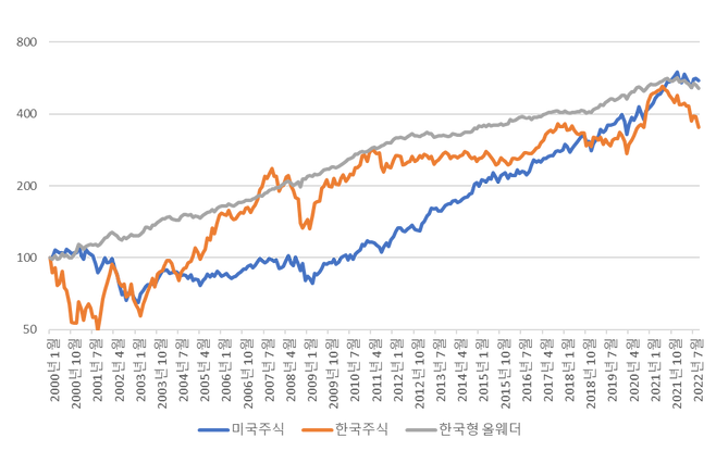 투자상황에 대한 예측은 힘듭니다. 그럴 땐 국내 상황에 대입한 '한국형 올웨더' 전략을 추천드립니다. 김성일 작가가 쓴 책 '마법의 투자 시나리오'의 내용을 기반으로 하는 한국형 올웨더는 △주식 35%(국내 주식 17.5%·미국 주식 17.5%) △채권 50%(한국 채권 10년물 25%·미국채 10년물 25%) △금 15% 등으로 구성됩니다. 이렇게 퀀트 투자한 경우, 연복리 7.8%의 수익이 발생했습니다.