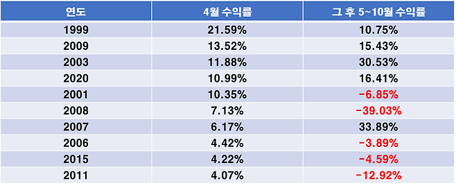 다만 예외적인 상황도 있었습니다. 국내 주식시장의 경우 4월 수익률이 평균(3%)보다 압도적으로 높을 경우, 5~10월에도 수익이 났습니다. 4월의 상승 모멘텀이 계속 이어졌기 때문입니다. 21.59%의 4월 수익률을 기록했던 1999년에는 5~10월에도 10.75%의 수익이 발생했습니다. 4월 수익률이 6.17%였던 2007년의 경우 5~10월 수익률은 33.89%로 오히려 더 높았습니다. 다만 항상 그런 것은 아닙니다. 2008년에는 4월 수익률이 7.13%였지만, 5~10월 -39.03%를 기록했습니다. 당시 리먼브라더스 사태로 글로벌 주식시장이 붕괴됐기 때문입니다.