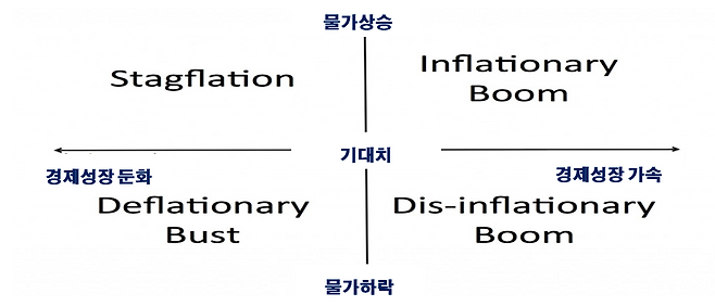 경제4계절에 따라 투자상품 별 수익률도 다릅니다. 스태그플레이션 상황에선 실물자산과 달러의 수익률이 좋고, 주식과 채권은 나쁘쁩니다. 인플레이션 상황에선 주식과 실물자산의 수익률은 높습니다. 반면 채권과 달러는 나쁩니다. 디스인플레이션의 경우 주식과 채권 수익률은 높고, 실물자산과 달러의 수익률은 낮습니다. 마지막으로 디플레이션 상황에선 주식과 실물자산의 수익률이 안좋고, 채권과 달러의 수익률이 높습니다.